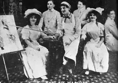 And here's the photo Noah mentions, of the Six Mascots in 1910, featuring Groucho as Hans Pumpernickel, performing "Schnitzelbank":